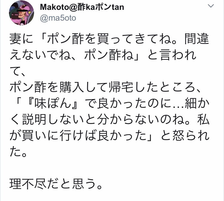 井戸端アンテナTOP > 嫁「ポン酢お願い」夫「はい」嫁「ポン酢って言ったのになんでポン酢買ったの?」 2020/10/27 嫁「ポン酢お願い」夫「はい」嫁「ポン酢って言ったのになんでポン酢買ったの?」https://hayabusa.open2ch.net/test/read.cgi/livejupiter/1603598697/1 :名無しさん@おーぷん:20/10/25(日)13:04:57 ID:n2H主 × 続きを読む - 未分類