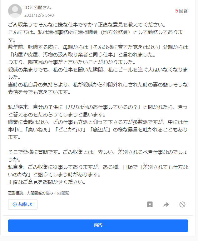 井戸端アンテナTOP > ごみ収集員の仕事してると伝えたら親戚中にハブられた。肉親からも否定された 2021/12/08 【悲報】ごみ収集員、親戚から差別されまくって泣く 1: 風吹けば名無し 2021/12/06(月) 15:45:59.97 ID:vf6xP2v60 続きを読む - 未分類