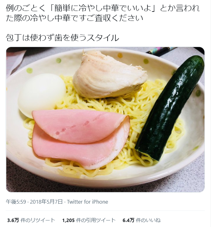 井戸端アンテナTOP > 夫に「簡単に冷やし中華でいいよ」と言われたから皿に素材をそのまま入れて出した 2022/08/02 夫「簡単に冷やし中華でいいよ」、妻「・・・わかった」 1: 名無しさん@おーぷん 22/07/28(木) 15:53:55 ID:Yn93 https://twitter.com/nimaimo27/status/993414977724665856 続きを読む - 未分類