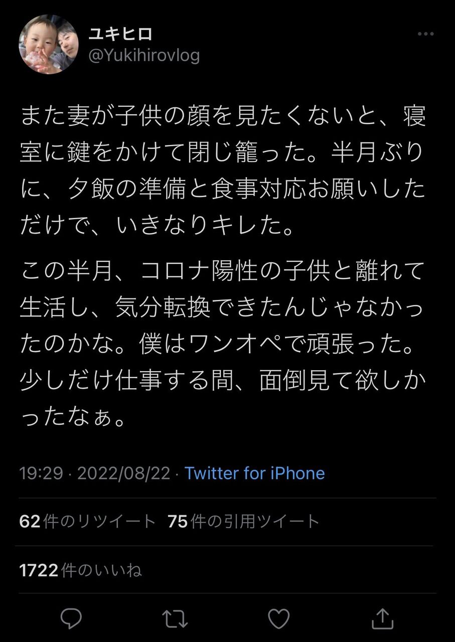 井戸端アンテナTOP > 妻が「子供の顔を見たくない」と言って寝室に鍵をかけて閉じこもってしまった 2022/08/26 【悲報】理解ある夫くん「妻が『子供の顔は見たくない』って部屋に閉じこもっちゃった」まんさん「夫が悪い」大炎上して垢消し逃亡 1: 名無しさん@おーぷん 22/08/24(水) 16:46:57 ID:gZ5O ええんか? 続きを読む - 未分類
